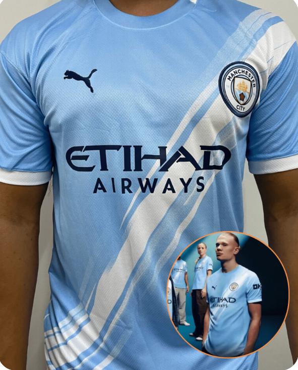 A camiseta oficial do Manchester City 2025/26 traz o clássico azul sky blue, com um design moderno que representa a elegância e o futebol dominante do clube inglês.